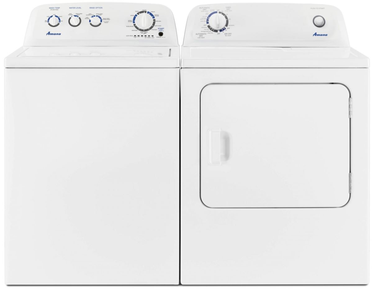 Amana® White Top Load Laundry Pair with a 4.4 cu. ft. capacity top load washer and 6.5 cu. ft. capacity electric dryer.Read More